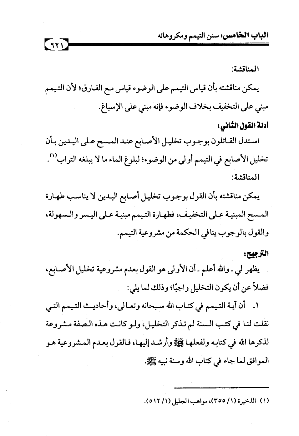 يمكن مناقشته بأن القول بوجوب تخليل أصابع اليدين لا يناسب طهارة المسح المبنية على التخفيف، فطهارة التيمم مبنية على اليسر والسهولة والقول بالوجوب ينافي الحكمة من مشروعية التيمم.