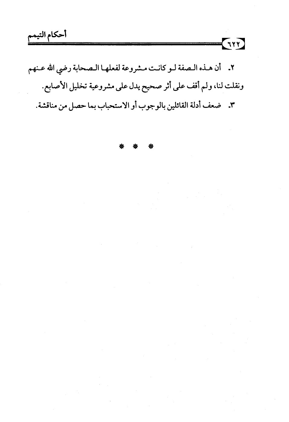 أن هذه الصفة لو كانت مشروعة لفعلها الصحابة رضي الله عنهم ونقلت لنا، ولم أقف على أثر صحيح يدل على مشروعية تخليل الأصابع.