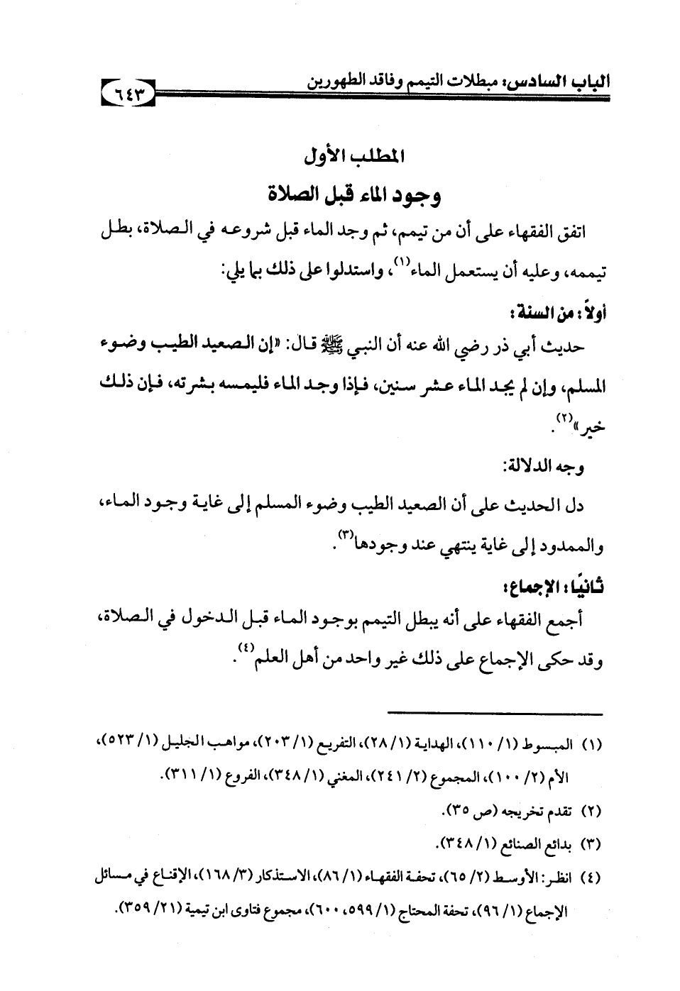 (¬1) المبسوط (1/ 110)، الهداية (1/ 28)، التفريع (1/ 203)، مواهب الجليل (1/ 523)، الأم (2/ 100)، المجموع (2/ 241)، المغني (1/ 348)، الفروع (1/ 311).