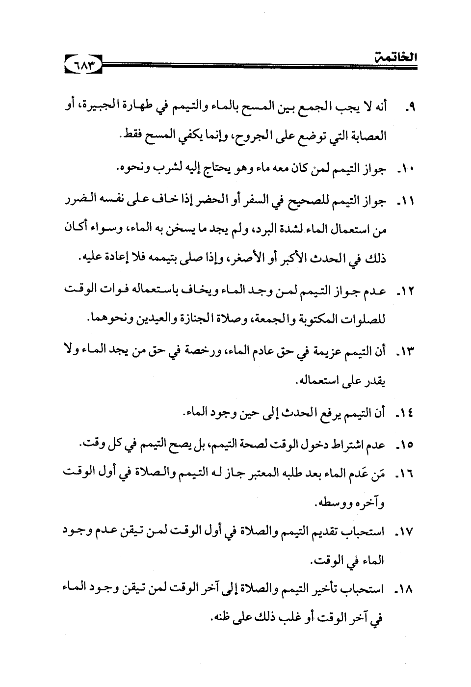 عدم جواز التيمم لمن وجد الماء ويخاف باستعماله فوات الوقت للصلوات المكتوبة والجمعة، وصلاة الجنازة والعيدين ونحوهما.