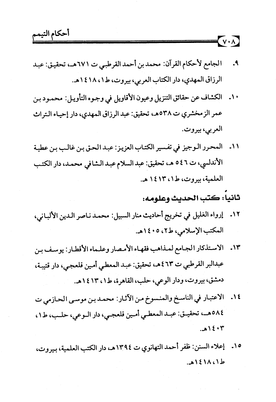 12 - إرواء الغليل في تخريج أحاديث منار السبيل: محمد ناصر الدين الألباني، المكتب الإسلامي، ط2، 1405هـ.