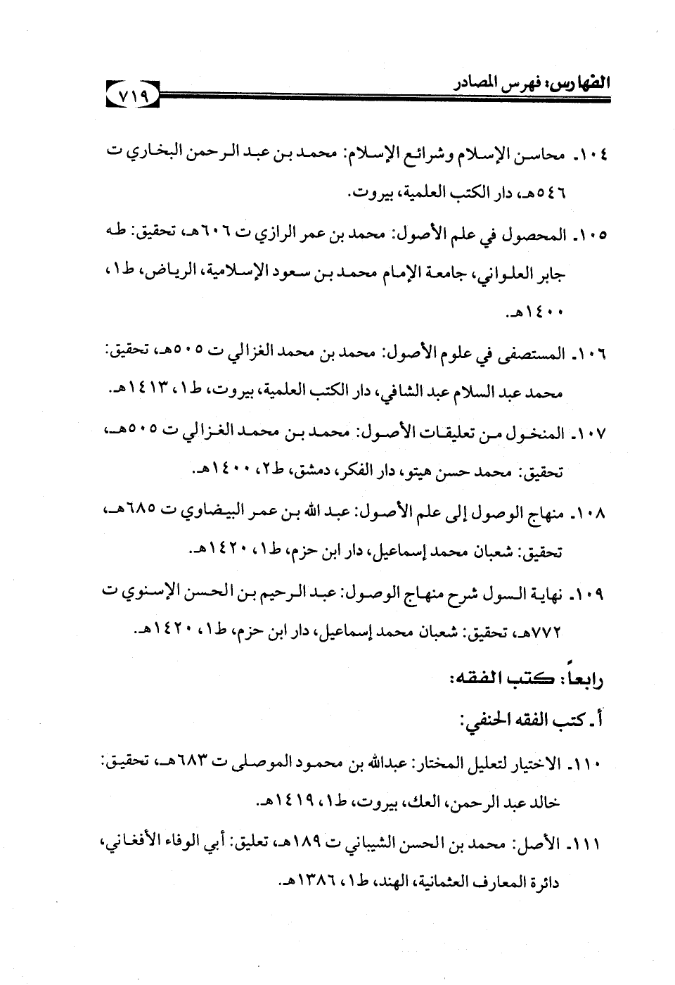 105 - المحصول في علم الأصول: محمد بن عمر الرازي ت 606هـ، تحقيق: طه جابر العلواني، جامعة الإمام محمد بن سعود الإسلامية، الرياض، ط1، 1400هـ.