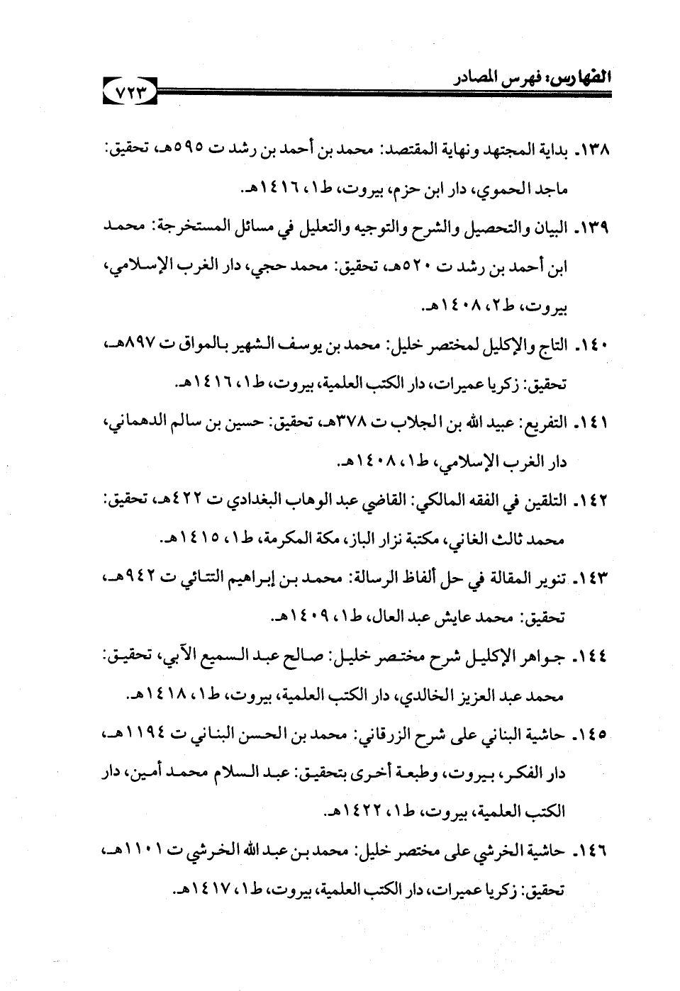 140 - التاج والإكليل لمختصر خليل: محمد بن يوسف الشهير بالمواق ت 897هـ، تحقيق: زكريا عميرات، دار الكتب العلمية، بيروت، ط1، 1416هـ.
