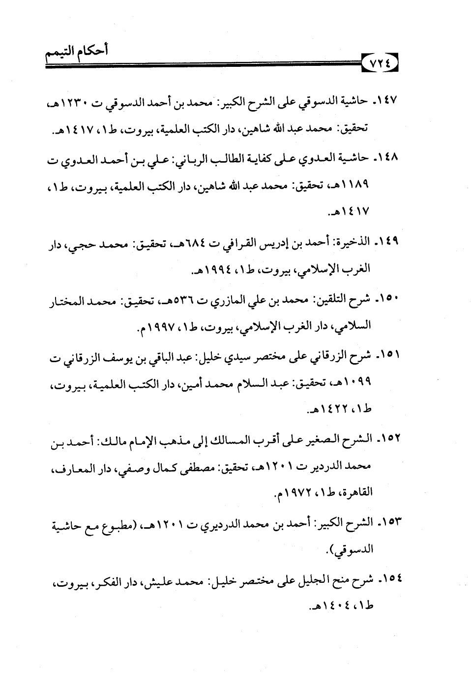147 - حاشية الدسوقي على الشرح الكبير: محمد بن أحمد الدسوقي ت 1230هـ، تحقيق: محمد عبد الله شاهين، دار الكتب العلمية، بيروت، ط1، 1417هـ.
