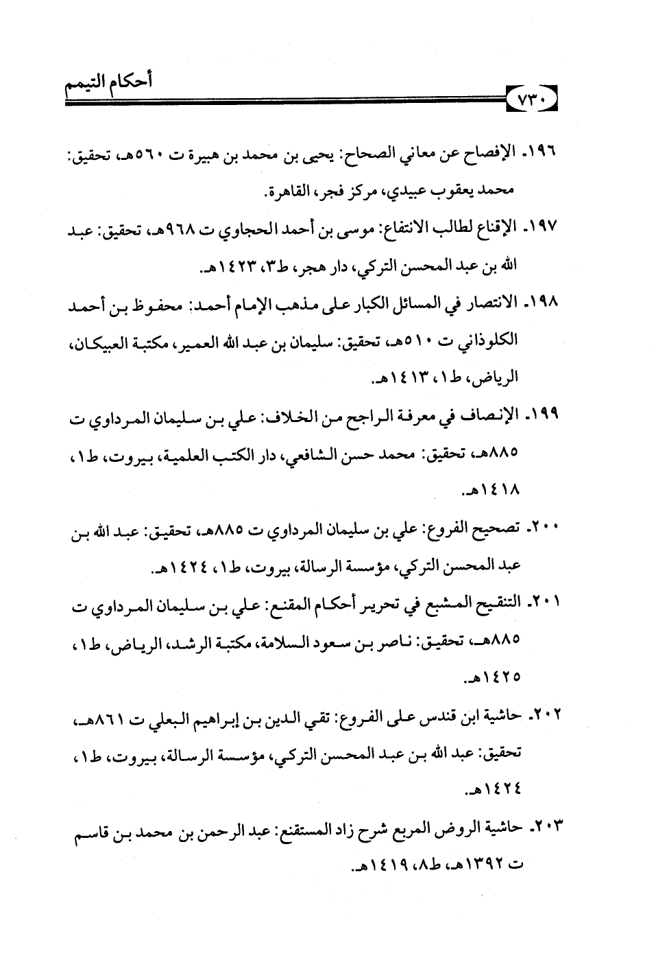 201 - التنقيح المشبع في تحرير أحكام المقنع: علي بن سليمان المرداوي ت 885هـ، تحقيق: ناصر بن سعود السلامة، مكتبة الرشد، الرياض، ط1، 1425هـ.