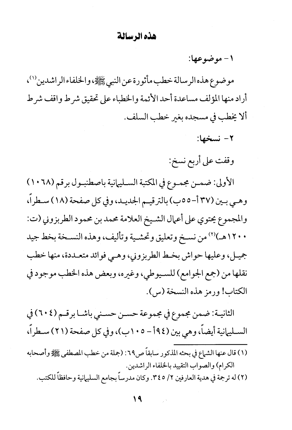 (¬1) قال عنها الشماع في بحثه المذكور سابقًا ص 69: (جملة من خطب المصطفى صلى الله عليه وسلم وأصحابه الكرام) والصواب التقييد بالخلفاء الراشدين.
