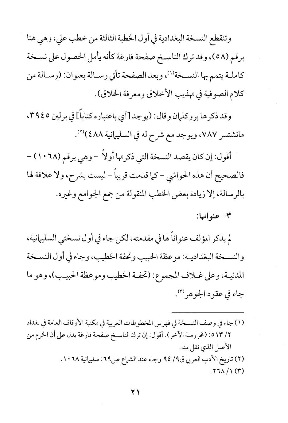وتنقطع النسخة البغدادية في أول الخطبة الثالثة من خطب علي، وهي هنا برقم (58)، وقد ترك الناسخ صفحة فارغة كأنه يأمل الحصول على نسخة كاملة يتمم بها النسخة (¬1)، وبعد الصفحة تأتي رسالة بعنوان: (رسالة من كلام الصوفية في تهذيب الأخلاق ومعرفة الخلاق).