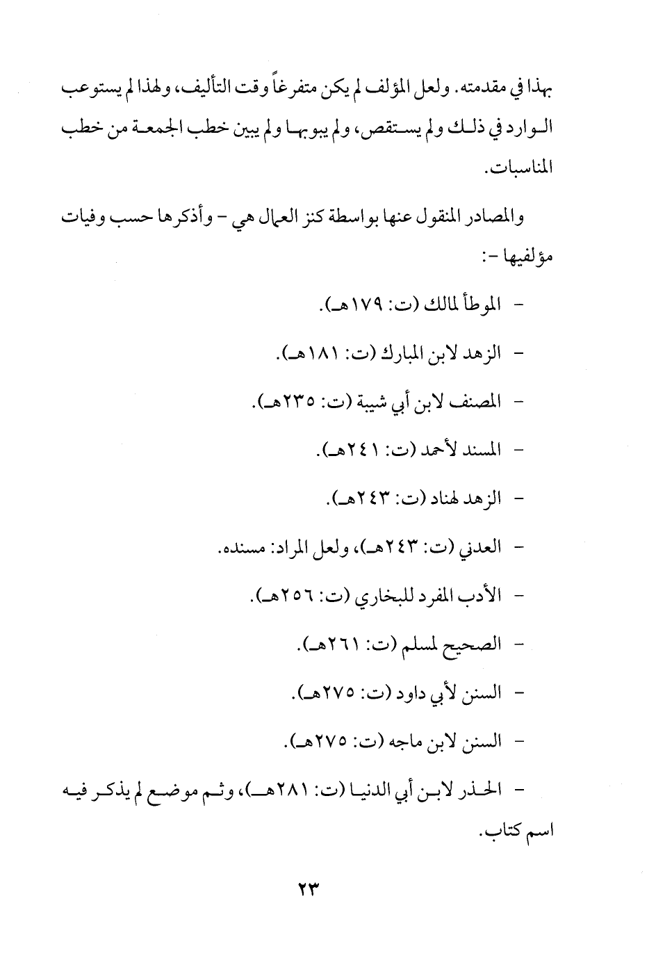 بهذا في مقدمته. ولعل المؤلف لم يكن متفرغًا وقت التأليف، ولهذا لم يستوعب الوارد في ذلك ولم يستقص، ولم يبوبها ولم يبين خطب الجمعة من خطب المناسبات.