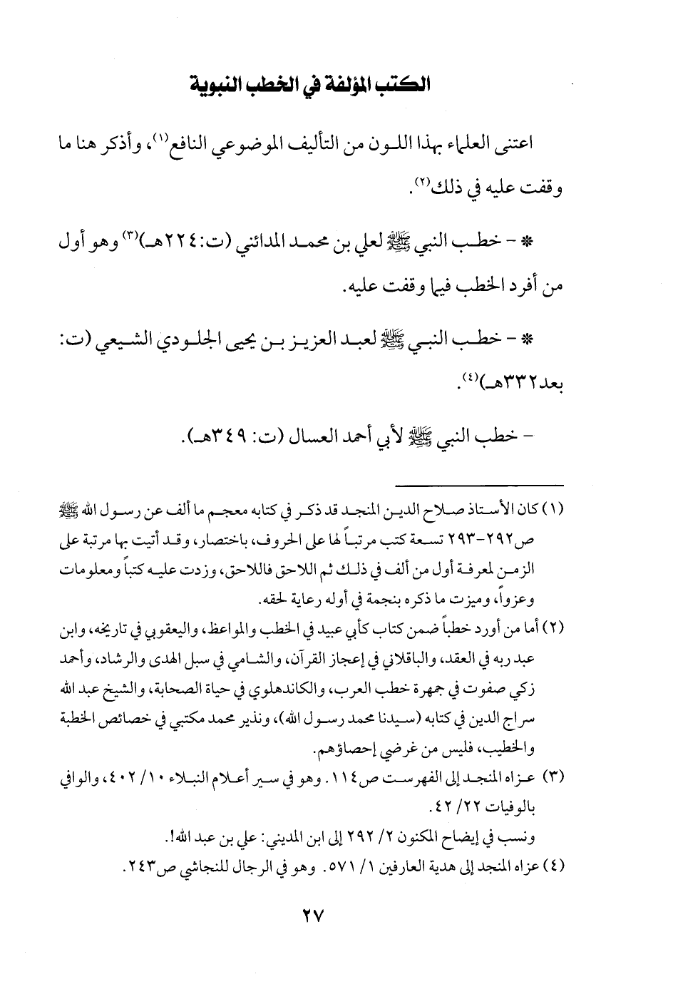 (¬2) أما من أورد خطبًا ضمن كتاب كأبي عبيد في الخطب والمواعظ، واليعقوبي في تاريخه، وابن عبد ربه في العقد، والباقلاني في إعجاز القرآن، والشامي في سبل الهدى والرشاد، وأحمد زكي صفوت في جمهرة خطب العرب، والكاندهلوي في حياة الصحابة، والشيخ عبد الله سراج الدين في كتابه (سيدنا محمد رسول الله)، ونذير محمد مكتبي في خصائص الخطبة والخطيب، فليس من غرضي إحصاؤهم.