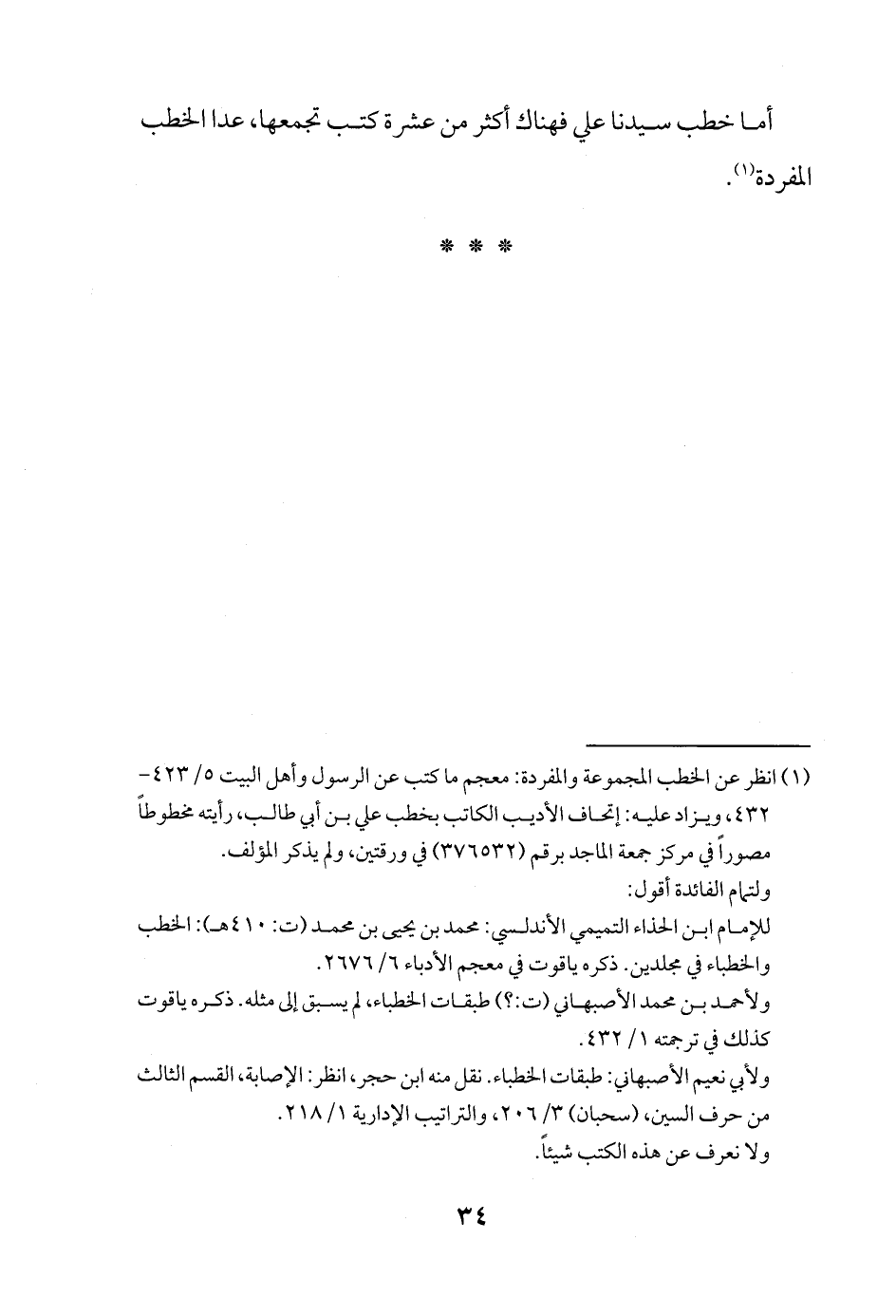 (¬1) انظر عن الخطب المجموعة والمفردة: معجم ما كتب عن الرسول وأهل البيت 5/ 423 - 432، ويزاد عليه: إتحاف الأديب الكاتب بخطب علي بن أبي طالب، رأيته مخطوطًا مصورًا في مركز جمعة الماجد برقم (376532) في ورقتين، ولم يذكر المؤلف.