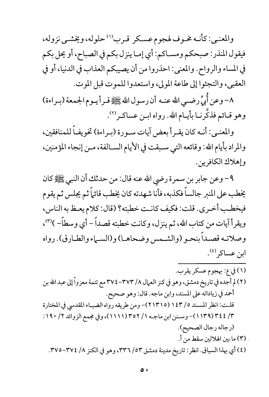 8 - وعن أُبيِّ رضي الله عنه أن رسول الله صلى الله عليه وسلم قرأ يوم الجمعة (براءة) وهو قائم فذكَّرنا بأيام الله. رواه ابن عساكر (¬2).