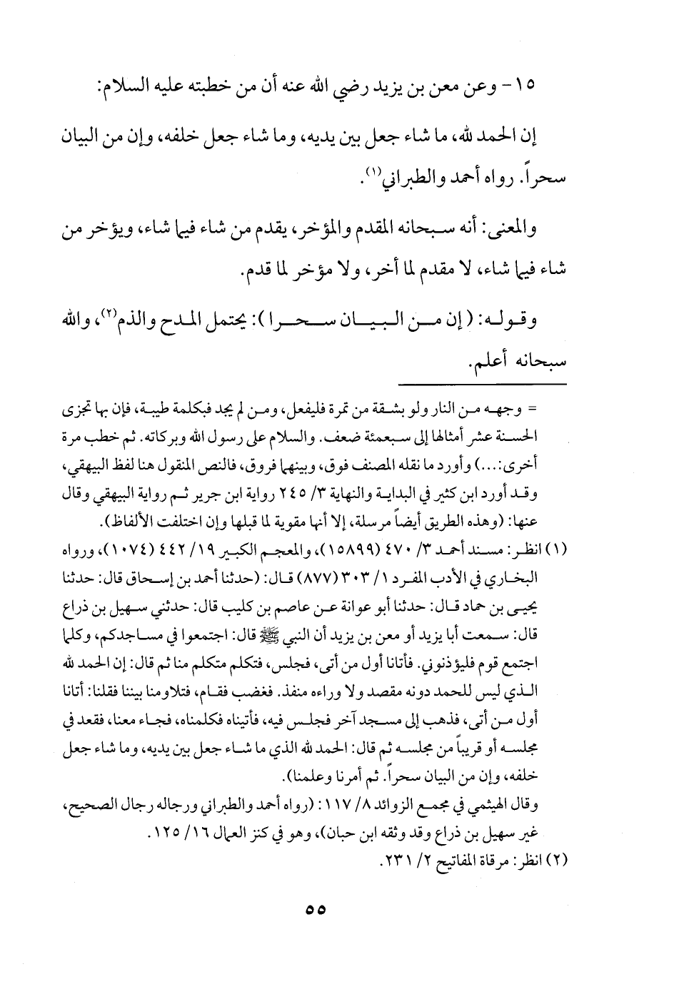 (¬1) انظر: مسند أحمد 3/ 470 (15899)، والمعجم الكبير 19/ 442 (1074)، ورواه البخاري في الأدب المفرد 1/ 303 (877) قال: (حدثنا أحمد بن إسحاق قال: حدثنا يحيى بن حماد قال: حدثنا أبو عوانة عن عاصم بن كليب قال: حدثني سهيل بن ذراع قال: سمعت أبا يزيد أو معن بن يزيد أن النبي صلى الله عليه وسلم قال: اجتمعوا في مساجدكم، وكلما اجتمع قوم فليؤذنوني. فأتانا أول من أتى، فجلس، فتكلم متكلم منا ثم قال: إن الحمد لله الذي ليس للحمد دونه مقصد ولا وراءه منفذ. فغضب فقام، فتلاومنا بيننا فقلنا: أتانا أول من أتى، فذهب إلى مسجد آخر فجلس فيه، فأتيناه فكلمناه، فجاء معنا، فقعد في مجلسه أو قريبًا من مجلسه ثم قال: الحمد لله الذي ما شاء جعل بين يديه، وما شاء جعل خلفه، وإن من البيان سحرًا. ثم أمرنا وعلمنا).