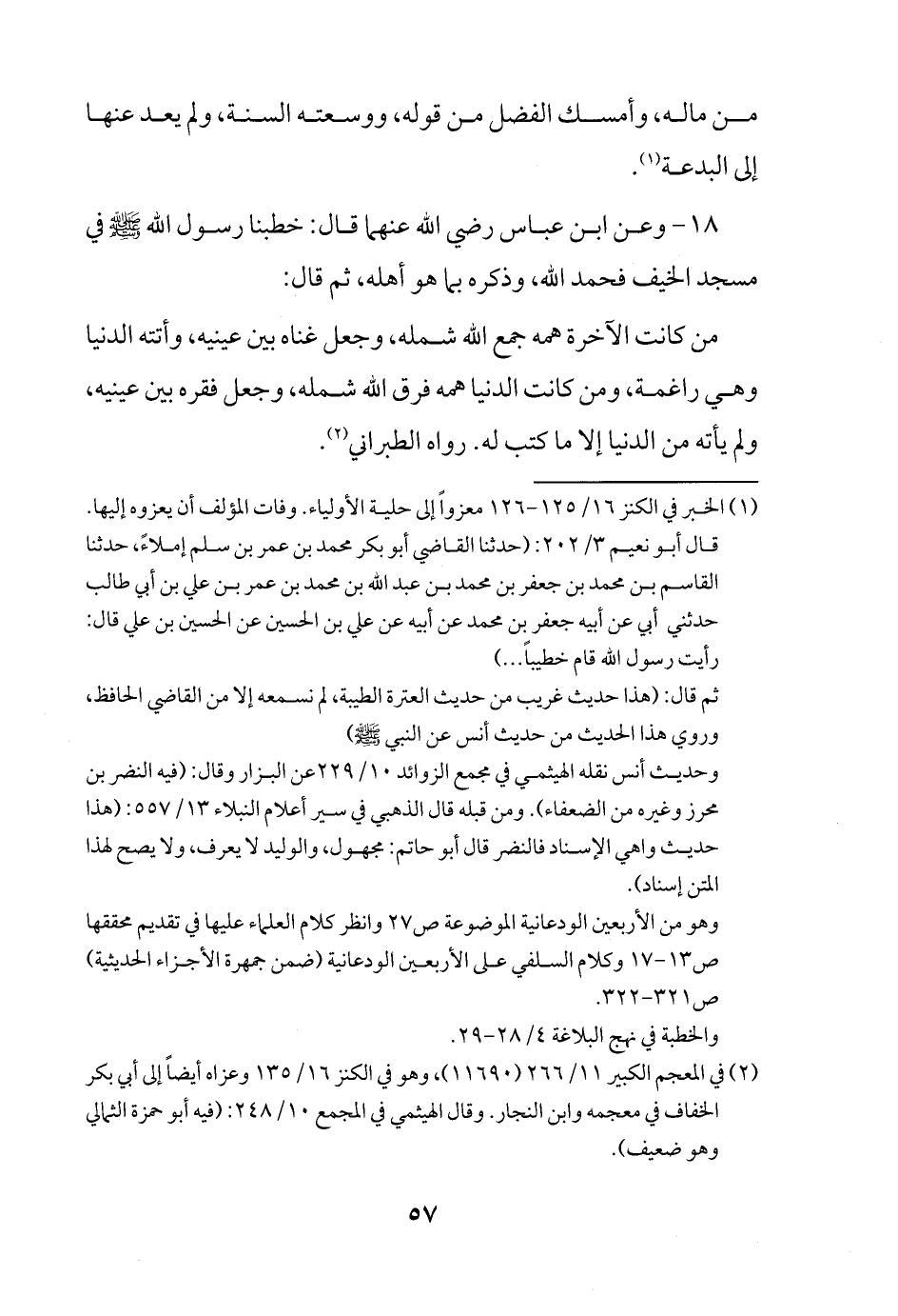 18 - وعن ابن عباس رضي الله عنهما قال: خطبنا رسول الله صلى الله عليه وسلم في مسجد الخيف فحمد الله، وذكره بما هو أهله، ثم قال: