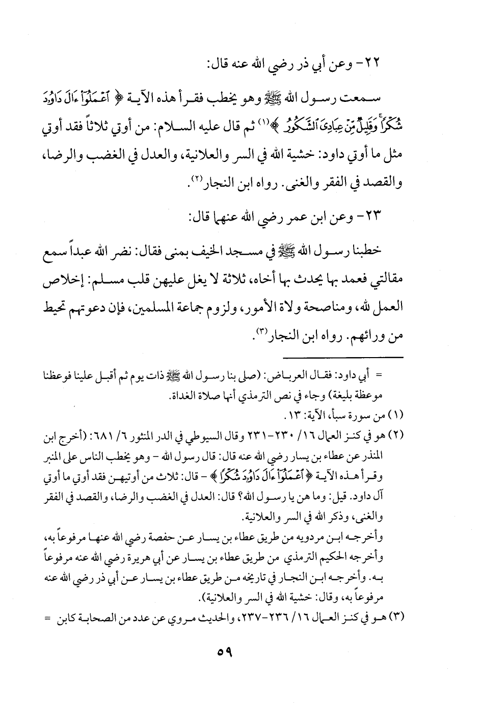(¬2) هو في كنز العمال 16/ 230 - 231 وقال السيوطي في الدر المنثور 6/ 681: (أخرج ابن المنذر عن عطاء بن يسار رضي الله عنه قال: قال رسول الله -وهو يخطب الناس على المنبر وقرأ هذه الآية {اعْمَلُوا آلَ دَاوُودَ شُكْرًا} - قال: ثلاث من أوتيهن فقد أوتي ما أوتي آل داود. قيل: وما هن يا رسول الله؟ قال: العدل في الغضب والرضا، والقصد في الفقر والغنى، وذكر الله في السر والعلانية.