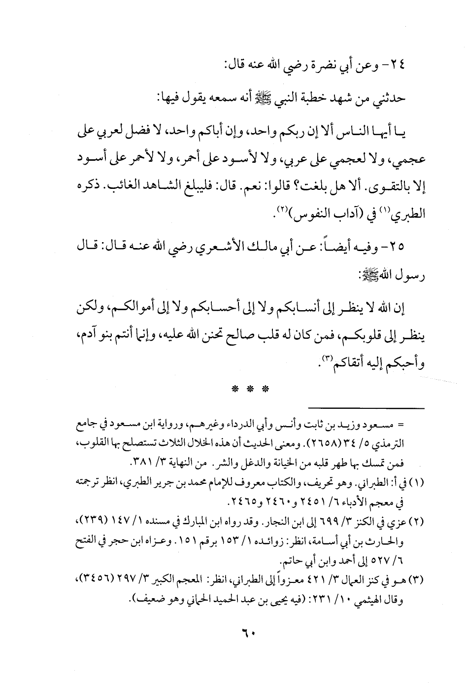 إن الله لا ينظر إلى أنسابكم ولا إلى أحسابكم ولا إلى أموالكم، ولكن ينظر إلى قلوبكم، فمن كان له قلب صالح تحنن الله عليه، وإنما أنتم بنو آدم، وأحبكم إليه أتقاكم (¬3).