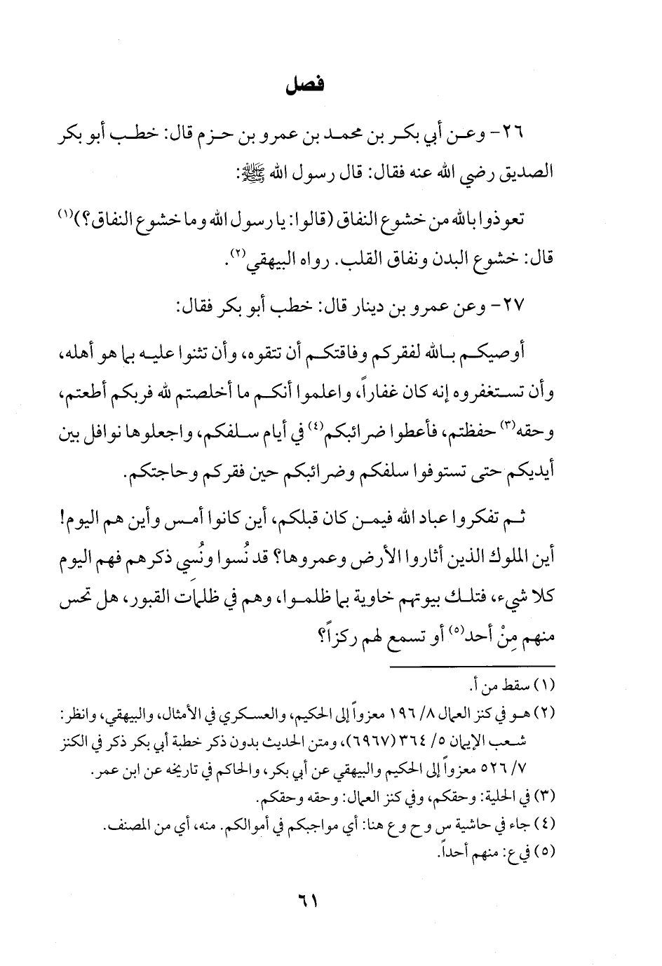 26 - وعن أبي بكر بن محمد بن عمرو بن حزم قال: خطب أبو بكر الصديق رضي الله عنه فقال: قال رسول الله صلى الله عليه وسلم: