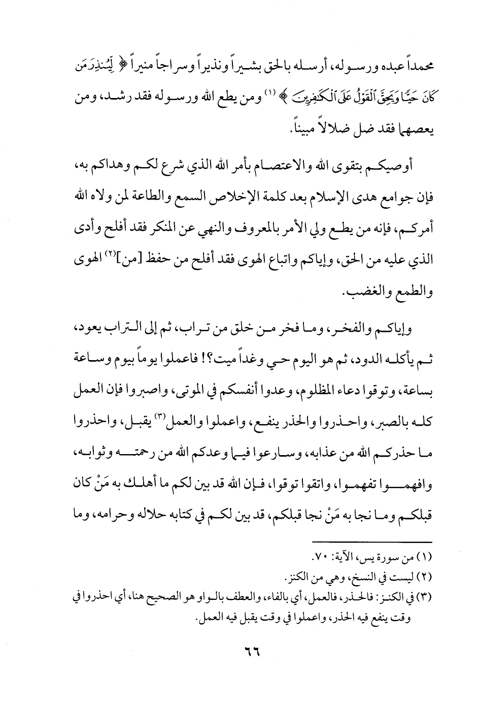 أوصيكم بتقوى الله والاعتصام بأمر الله الذي شرع لكم وهداكم به، فإن جوامع هدى الإسلام بعد كلمة الإخلاص السمع والطاعة لمن ولاه الله أمركم، فإنه من يطع ولي الأمر بالمعروف والنهي عن المنكر فقد أفلح وأدى الذي عليه من الحق، وإياكم واتباع الهوى فقد أفلح من حفظ [من] (¬2) الهوى والطمع والغضب.