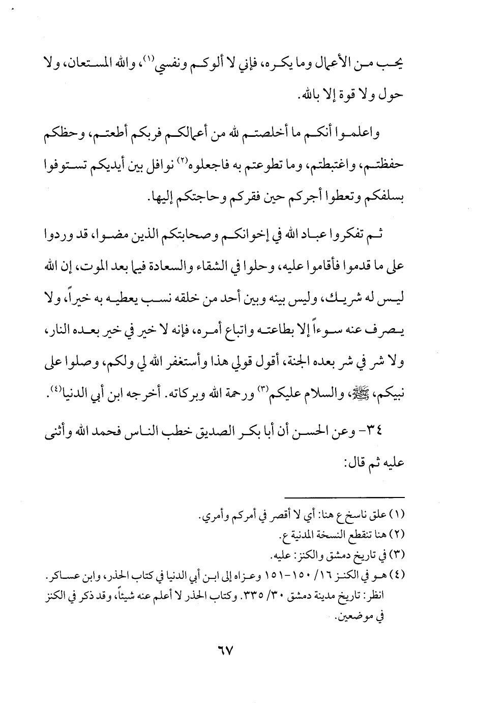 34 - وعن الحسن أن أبا بكر الصديق خطب الناس فحمد الله وأثنى عليه ثم قال: