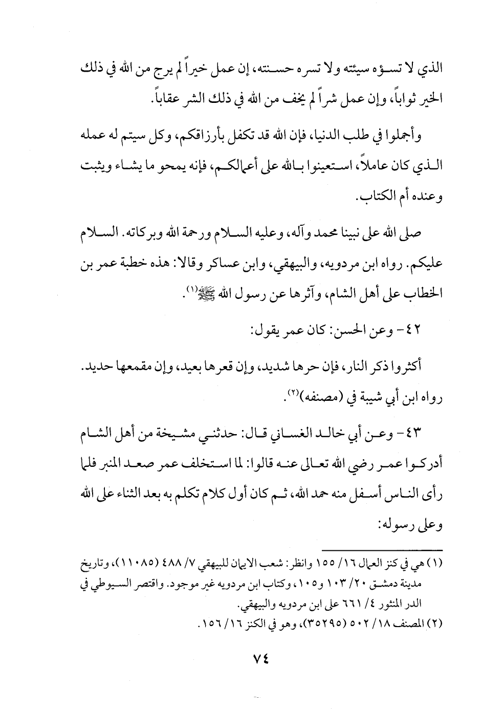 صلى الله على نبينا محمد وآله، وعليه السلام ورحمة الله وبركاته. السلام عليكم. رواه ابن مردويه، والبيهقي، وابن عساكر وقالا: هذه خطبة عمر بن الخطاب على أهل الشام، وآثرها عن رسول الله صلى الله عليه وسلم (¬1).
