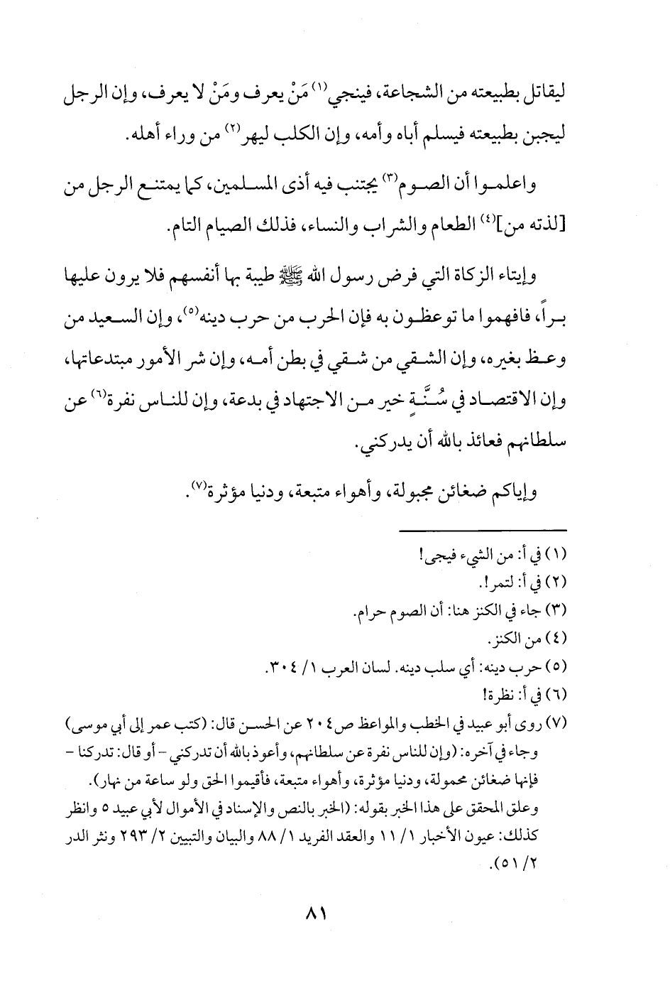 (¬7) روى أبو عبيد في الخطب والمواعظ ص 204 عن الحسن قال: (كتب عمر إلى أبي موسى) وجاء في آخره: (وإن للناس نفرة عن سلطانهم، وأعوذ بالله أن تدركني -أو قال: تدركنا- فإنها ضغائن محمولة، ودنيا مؤثرة، وأهواء متبعة، فأقيموا الحق ولو ساعة من نهار).