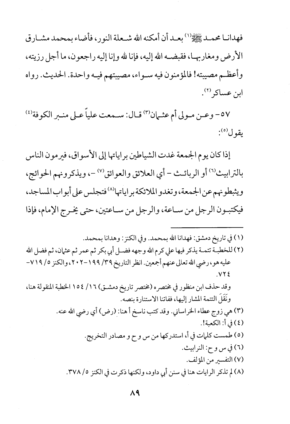 وقد حذف ابن منظور في مختصره (مختصر تاريخ دمشق) 16/ 154 الخطبة المنقولة هنا، ونَقَلَ التتمة المشار إليها، ففاتنا الاستنارة بنصه.
