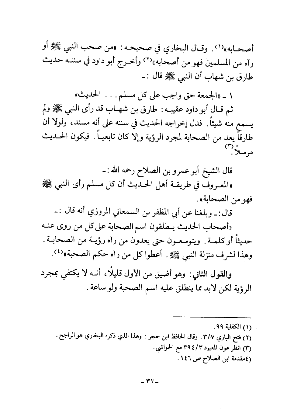 "أصحاب الحديث يطلقون اسم الصحابة على كل من روى عنه حديثاً أو كلمة. ويتوسعون حتى يعدون من رآه رؤية من الصحابة. وهذا لشرف منزلة النبي صلى الله عليه وسلم. أعطوا كل من رآه حكم الصحبة"4.
