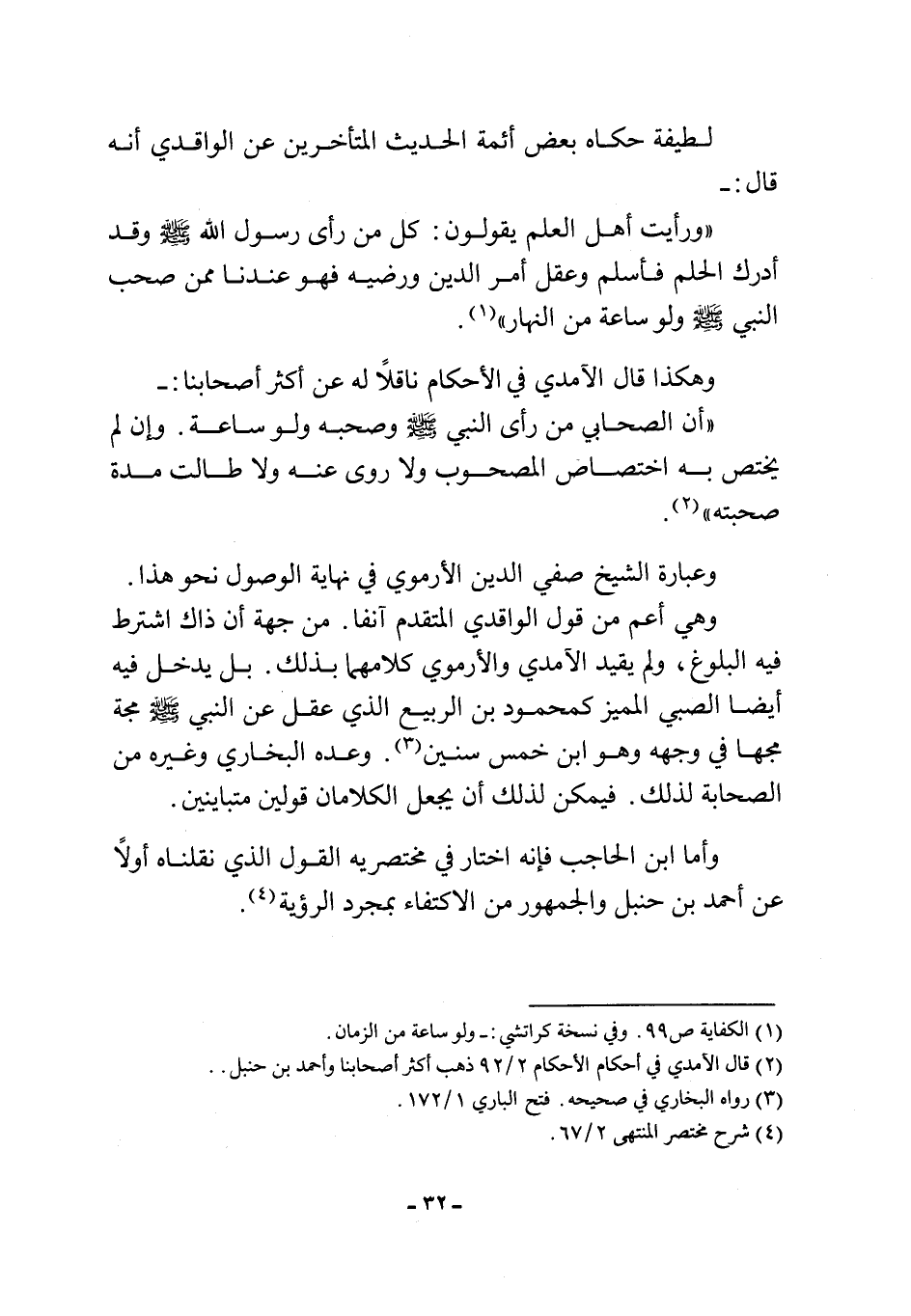 وهي أعم من قول الواقدي المتقدم آنفاً. من جهة أن ذاك اشترط فيه البلوغ، ولم يقيد الآمدي والأرموي كلامهما بذلك. بل يدخل فيه أيضاً الصبي المميز كمحمود بن الربيع الذي عقل عن النبي صلى الله عليه وسلم مجة مجها في وجهه وهو ابن خمس سنين3. وعده البخاري وغيره من الصحابة لذلك. فيمكن لذلك أن يجعل الكلامان قولين متباينين.