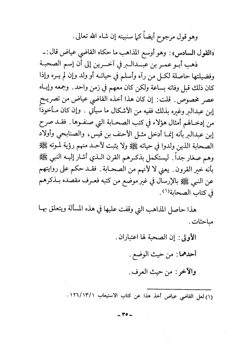 قلت: إن كان هذا أخذه القاضي عياض من تصريح إبن عبد البر وغيره بذلك، ففيه من الأشكال ما سيأتي. وإن كان مأخوذاً من إدخالهم أمثال هؤلاء في كتب الصحابة التي صنفوها، فقد صرح إبن عبد البر بأنه إنما أدخل مثل الأحنف بن قيس، والصنابحي، وأولاد الصحابة الذين ولدوا في حياته صلى الله عليه وسلم، ولا يثبت لأحد منهم رؤية لموته صلى الله عليه وسلم وهم صغار جداً. ليستكمل بذكرهم القرن الذي أشار إليه النبي صلى الله عليه وسلم بأنه خير القرون. يعني لا لأنهم من الصحابة. فقد حكم على روايتهم عن النبي صلى الله عليه وسلم بالإرسال في غير موضع من كتبه، فعرف مقصده بذكرهم في كتاب الصحابة1.