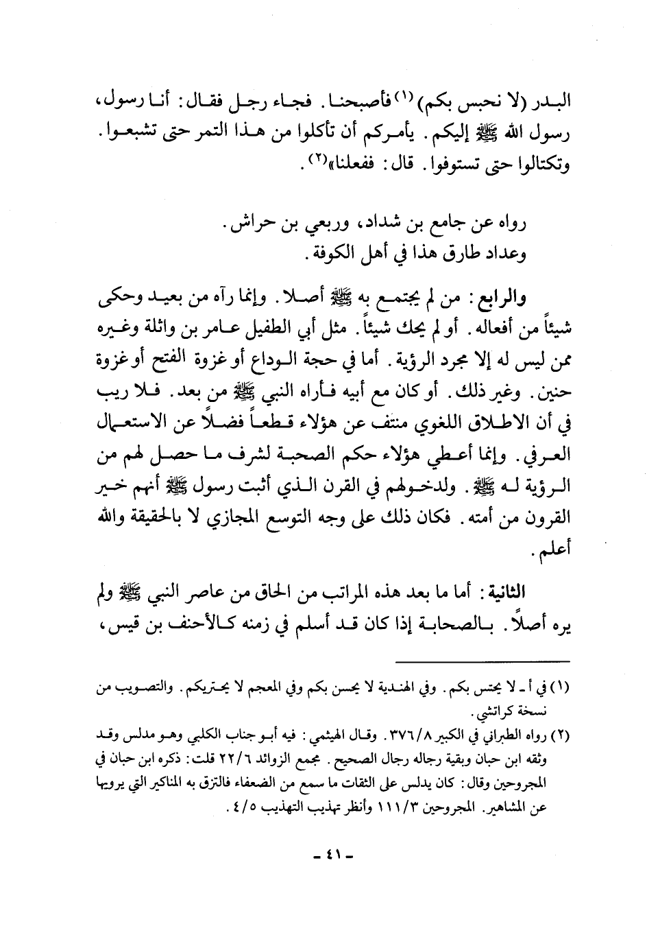 والرابع: من لم يجتمع به صلى الله عليه وسلم أصلاً. وإنما رآه من بعيد، وحكى شيئاً من أفعاله. أو لم يحك شيئاً. مثل أبي الطفيل عامر بن واثلة وغيره ممن ليس له إلا مجرد الرؤية. أما في حجة الوداع أو غزوة الفتح أو غزوة حنين. وغير ذلك. أو كان مع أبيه فأراه النبي صلى الله عليه وسلم من بعد.