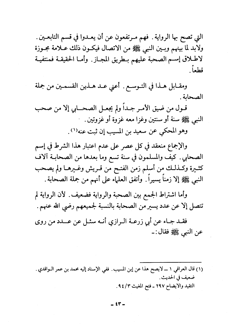 وأما اشتراط الجمع بيه الصحبة والرواية فضعيف. لأن الرواية لم تتصل إلا عن عدد يسير من الصحابة بالنسبة لجميعهم رضي الله عنهم.