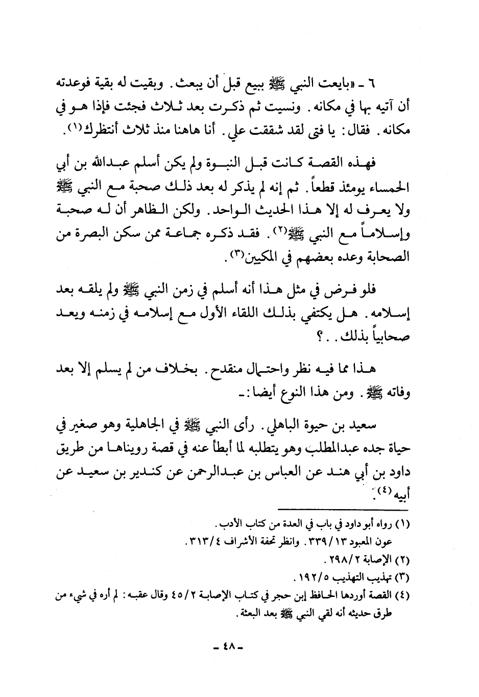 4 القصة أوردها الحافظ ابن حجر في كتاب الإصابة 2/45. وقال عقبه: لم أره في شيء من طرق حديثه أنه لقي النبي صلى الله عليه وسلم بعد البعثة.