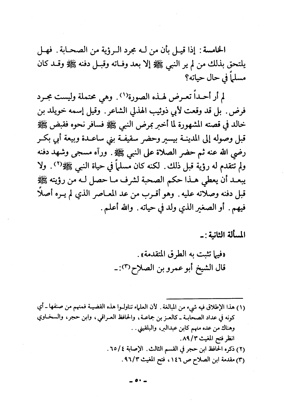 1هذا الإطلاق فيه شيء من المبالغة. لأن العلماء تناولوا هذه القضية فمنهم من صنفها – أي كونه في عداد الصحابة- كالعز بن جماعة، والحافظ العراقي، وابن حجر، والسخاوي، وهناك من عده منهم كابن عبد البر والبلقيني.