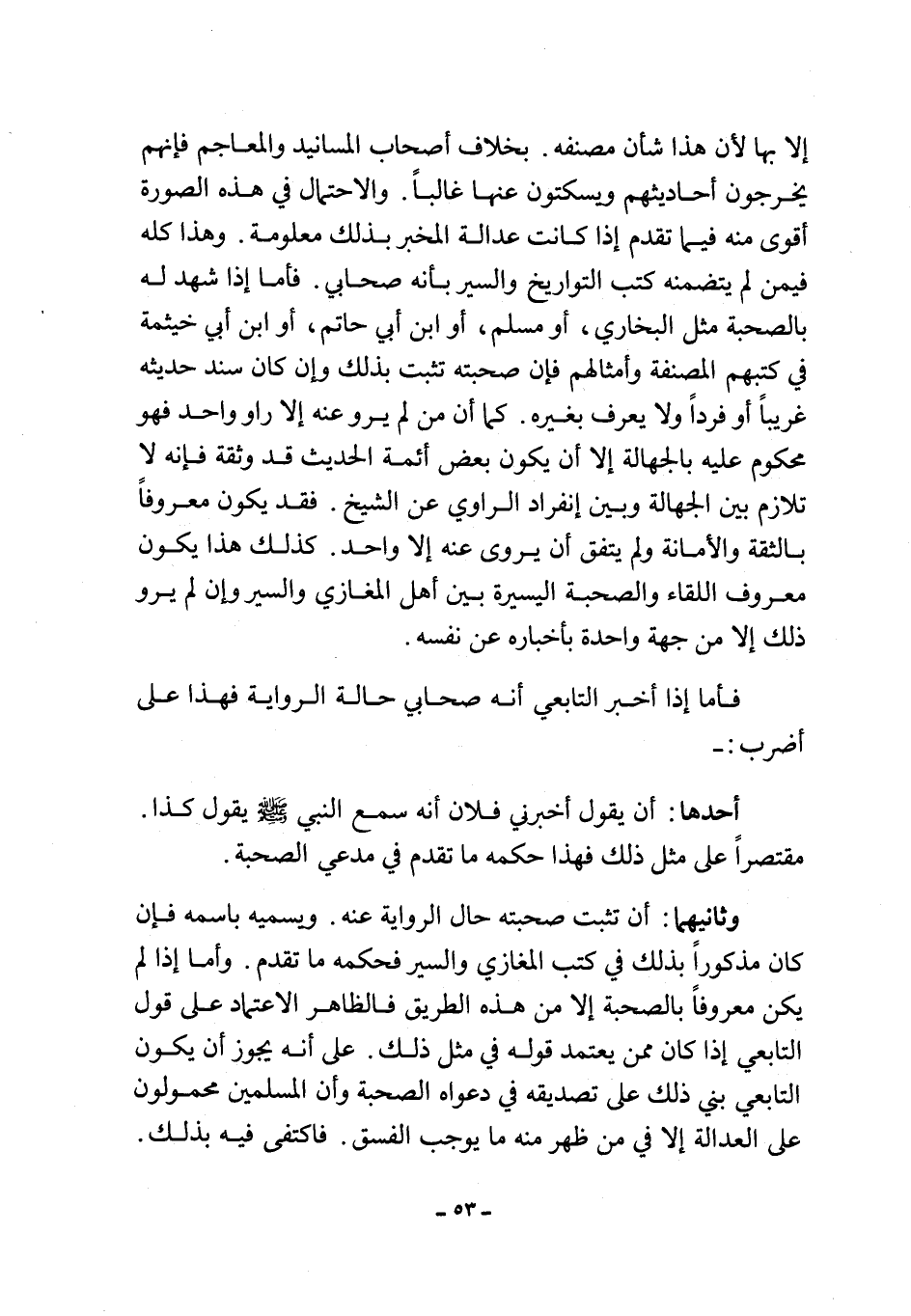وثانيهما: أن تثبت صحبته حال الرواية عنه، ويسميه باسمه، فإن كان مذكوراً بذلك في كتب المغازي والسير فحكمه ما تقدم. وأما إذا لم يكن معروفاً بالصحبة إلا من هذه الطريق فالظاهر الإعتماد على قول التابعي إذا كان ممن يعتمد قوله في مثل ذلك. على أنه يجوز أن يكون التابعي بنى ذلك على تصديقه في دعواه الصحبة وأن المسلمين محمولون على العدالة إلا في من ظهر منه ما يوجب الفسق، فاكتفى فيه بذلك