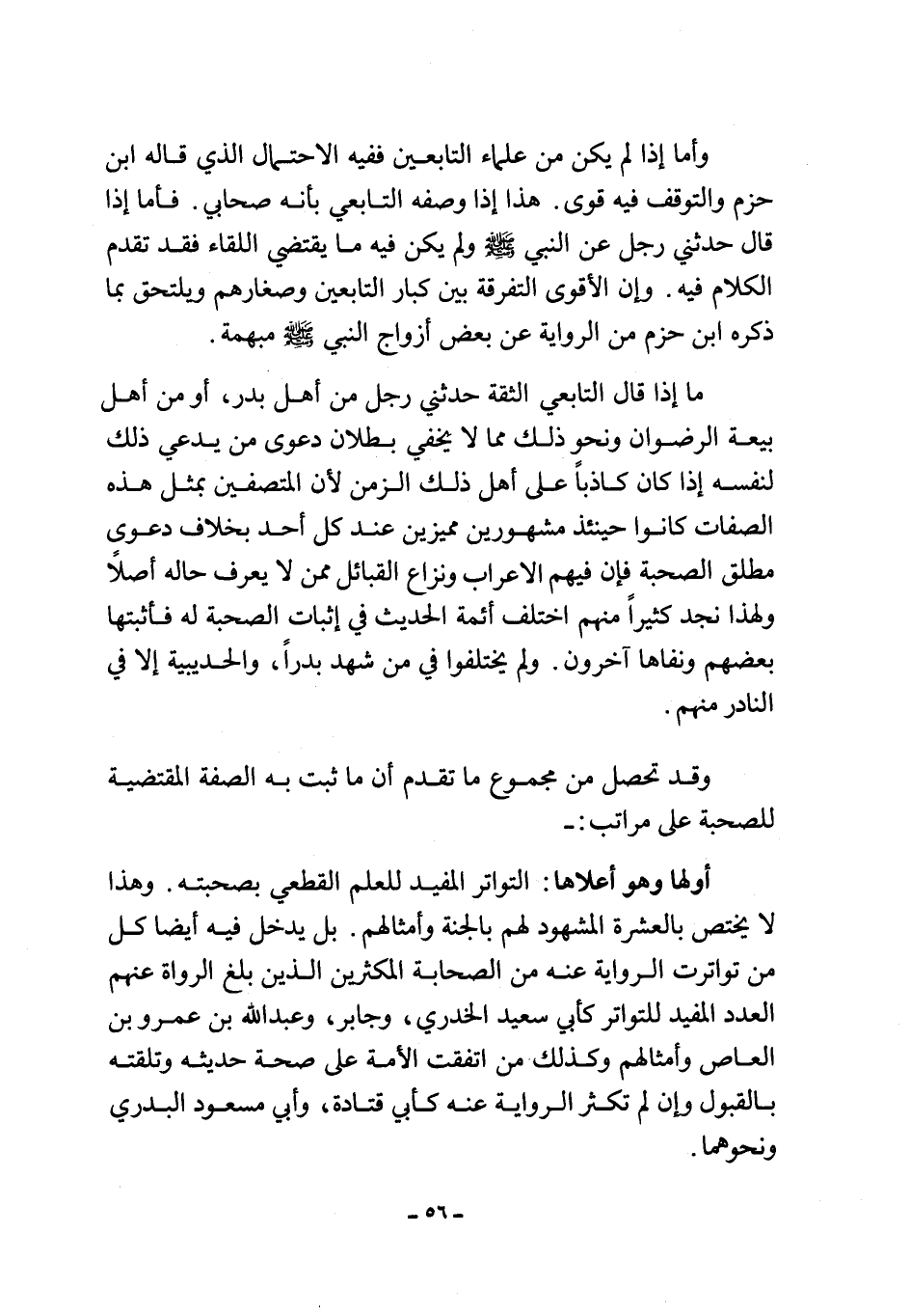 وأما إذا لم يكن من علماء التابعين ففيه الاحتمال الذي قاله ابن حزم والتوقف فيه قوى. هذا إذا وصفه التابعي بأنه صحابي، فأما إذا قال حدثني رجل عن النبي صلى الله عليه وسلم ولم يكن فيه ما يقتضي اللقاء، فقد تقدم الكلام فيه، وإن الأقوى التفرقة بين كبار التابعين وصغارهم، ويلتحق بما ذكره ابن حزم من الراوية عن بعض أزواج النبي صلى الله عليه وسلم مبهمة.