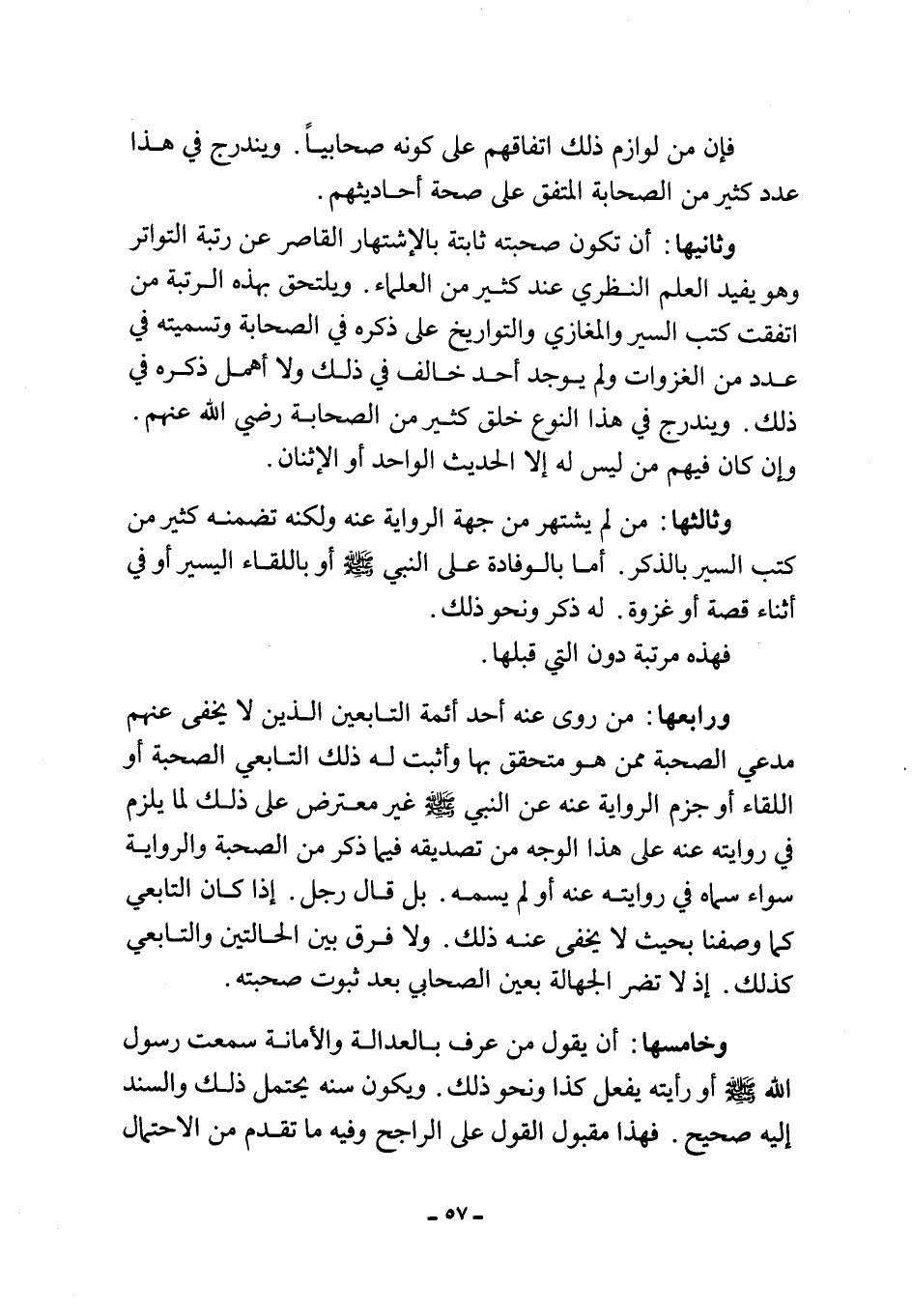 ورابعها: من روى عنه أحد أئمة التابعين الذين لا يخفى عنهم مدعي الصحبة ممن هو متحقق بها وأثبت له ذلك التابعي الصحبة أو اللقاء أو جزم الرواية عنه عن النبي صلى الله عليه وسلم غير معترض على ذلك لما يلزم في روايته عنه على هذا الوجه من تصديقه فيما ذكر من الصحبة والرواية سواء سماه في روايته عنه أو لم يسمه. بل قال رجل: إذا كان التابعي كما وصفنا بحيث لا يخفى عنه ذلك، ولا فرق بين الحالتين والتابعي كذلك. إذ لا تضر الجهالة بعين الصحابي بعد ثبوت صحبته.