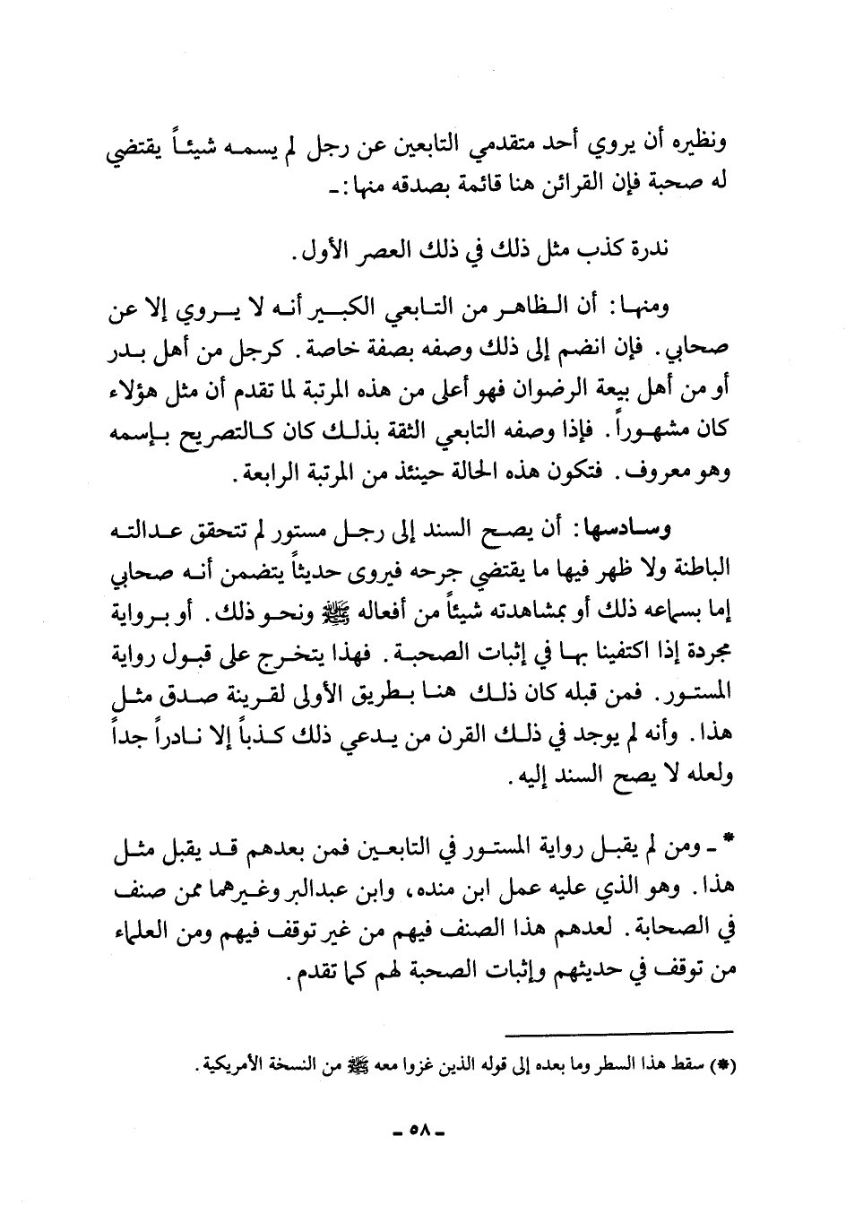 ومنها: أن الظاهر من التابعي الكبير أنه لا يروي إلا عن صحابي. فإن انضم إلى ذلك وصفه بصفة خاصة، كرجل من أهل بدر أو من أهل بيعة الرضوان فهو أعلى من هذه المرتبة لما تقدم أن مثل هؤلاء كان مشهوراً. فإذا وصفه التابعي الثقة بذلك كان كالتصريح باسمه وهو معروف. فتكون هذه الحالة حينئذ من المرتبة الرابعة.