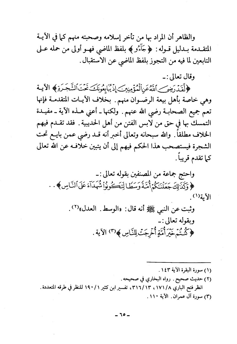 وقال تعالى: {لَقَدْ رَضِيَ اللَّهُ عَنِ الْمُؤْمِنِينَ إِذْ يُبَايِعُونَكَ تَحْتَ الشَّجَرَةِ} الآية، وهي خاصة بأهل بيعة الرضوان منهم. بخلاف الآيات المتقدمة فإنها تعم جميع الصحابة رضي الله عنهم. ولكنها –أعني هذه الآية- مفيدة التمسك بها في حق من لابس الفتن من أهل الحديبية. فقد تقدم فيهم الخلاف مطلقاً. والله سبحانه وتعالى أخبر أنه قد رضي عمن بايع تحت الشجرة فيستصحب هذا الحكم فيهم إلى أن يتبين خلافه عن الله تعالى، كما تقدم قريباً.