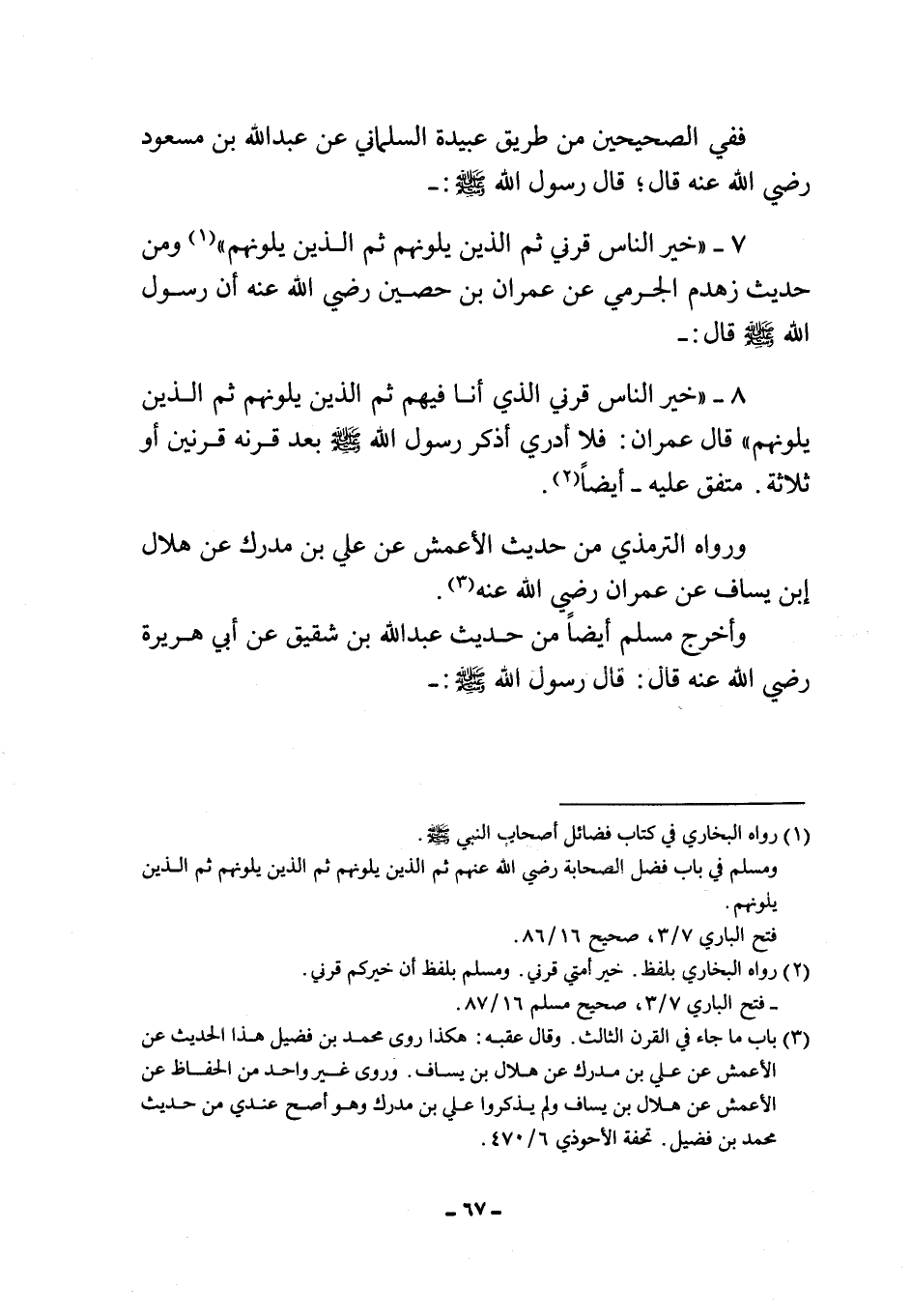 8- "خير الناس قرني الذي أنا فيهم ثم الذين يلونهم ثم الذين يلونهم" قال عمران: فلا أدري أذكر رسول الله صلى الله عليه وسلم بعد قرنه قرنين أو ثلاثة. متفق عليه – أيضاً2.
