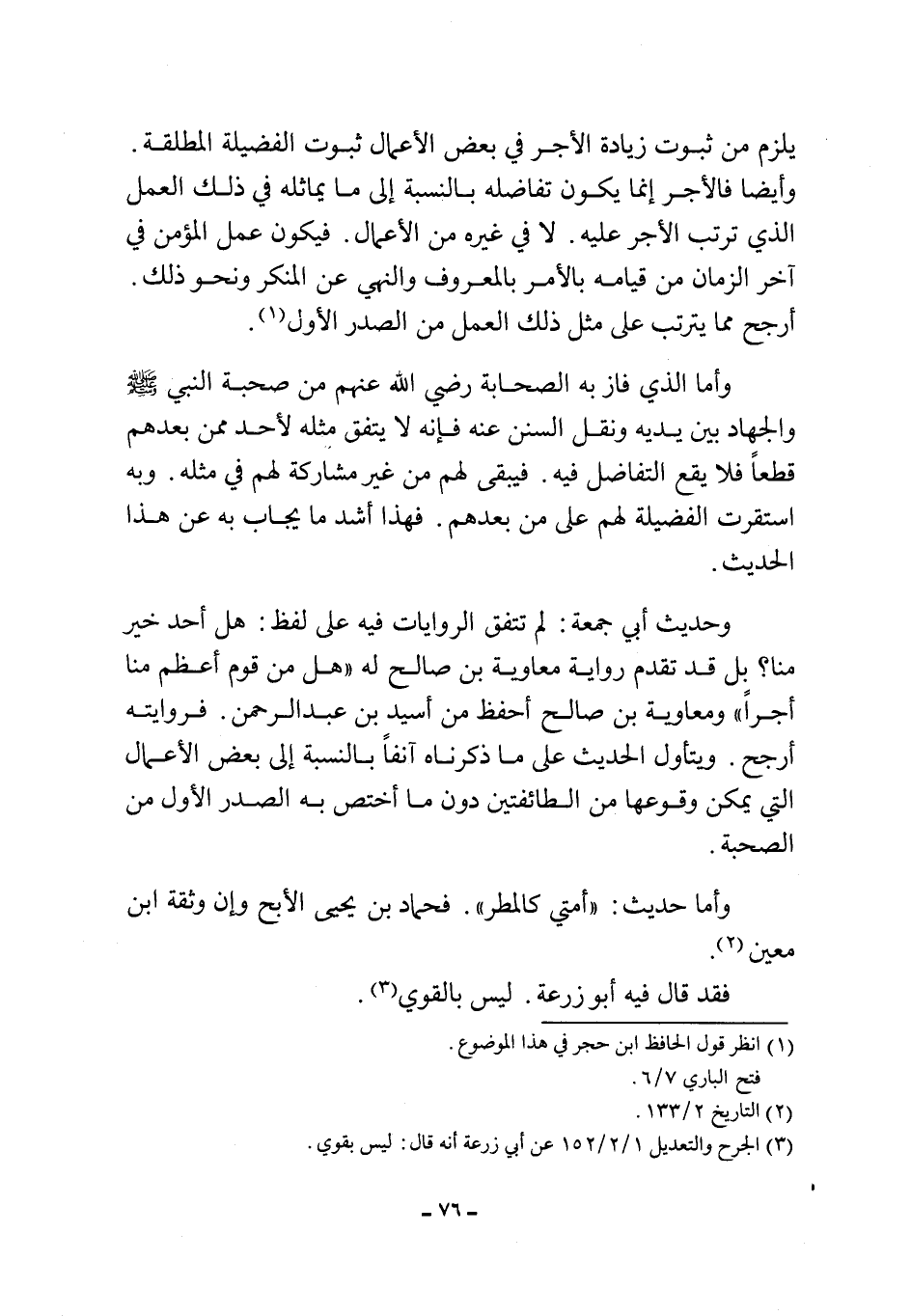 وحديث أبي جمعة: لم تتفق الروايات فيه على لفظ: هل أحد خير منا؟ بل قد تقدم رواية معاوية بن صالح له "هل من قوم أعظم منا أجراً"، ومعاوية بن صالح أحفظ من أسيد بن عبد الرحمن. فروايته أرجح. ويتأول الحديث على ما ذكرناه آنفاً بالنسبة إلى بعض الأعمال التي يمكن وقوعها من الطائفتين، دون ما أختص به الصدر الأول من الصحبة.
