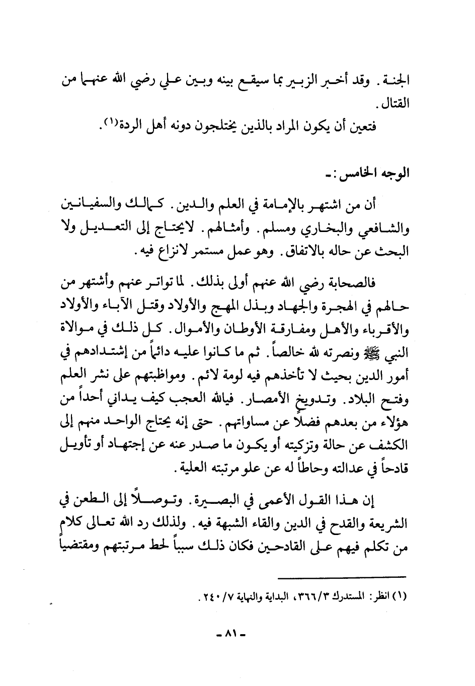 ثم ما كانوا عليه دائماً من إشتدادهم في أمور الدين بحيث لا تأخذهم فيه لومة لائم، ومواظبتهم على نشر العلم وفتح البلاد، وتدويخ الأمصار، فيا لله العجب كيف يداني أحداً من هؤلاء من بعدهم فضلاً عن مساواتهم، حتى إنه يحتاج الواحد منهم إلى الكشف عن حاله وتزكيته أو يكون ما صدر عنه عن إجتهاد أو تأويل قادحاً في عدالته وحاطاً له عن علو مرتبته العلية.