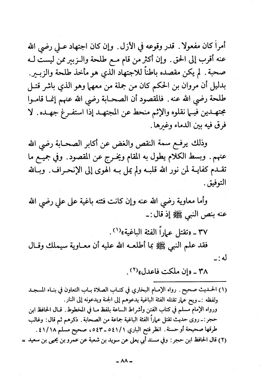 وأما معاوية رضي الله عنه وإن كانت فئته باغية على علي رضي الله عنه بنصّ النبي صلى الله عليه وسلم إذ قال: