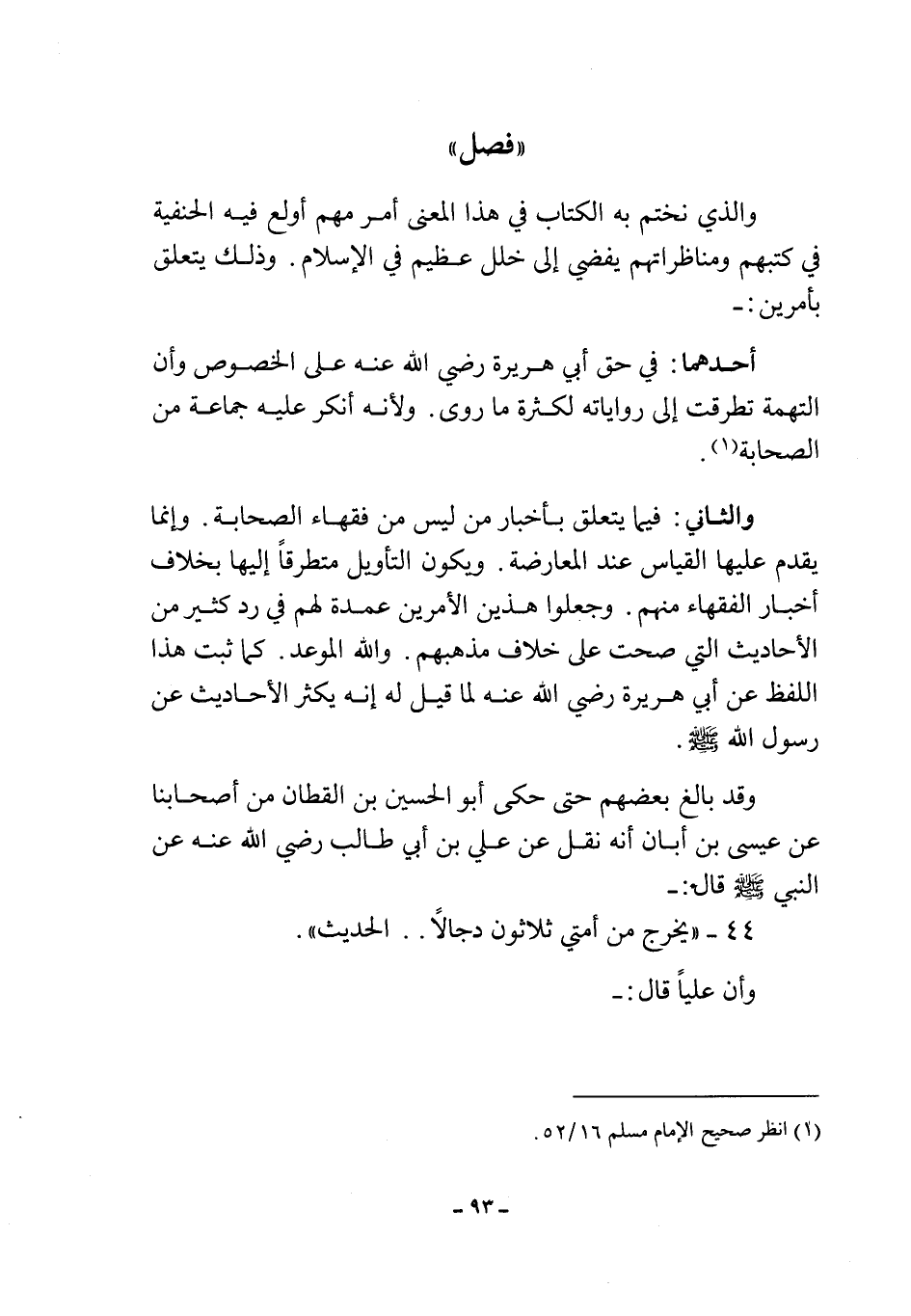 والثاني: فيما يتعلق بأخبار من ليس من فقهاء الصحابة، وإنما يقدم عليها القياس عند المعارضة، ويكون التأويل متطرقاً إليها بخلاف أخبار الفقهاء منهم، وجعلوا هذين الأمرين عمدة لهم في رد كثير من الأحاديث التي صحت على خلاف مذهبهم. والله الموعد.