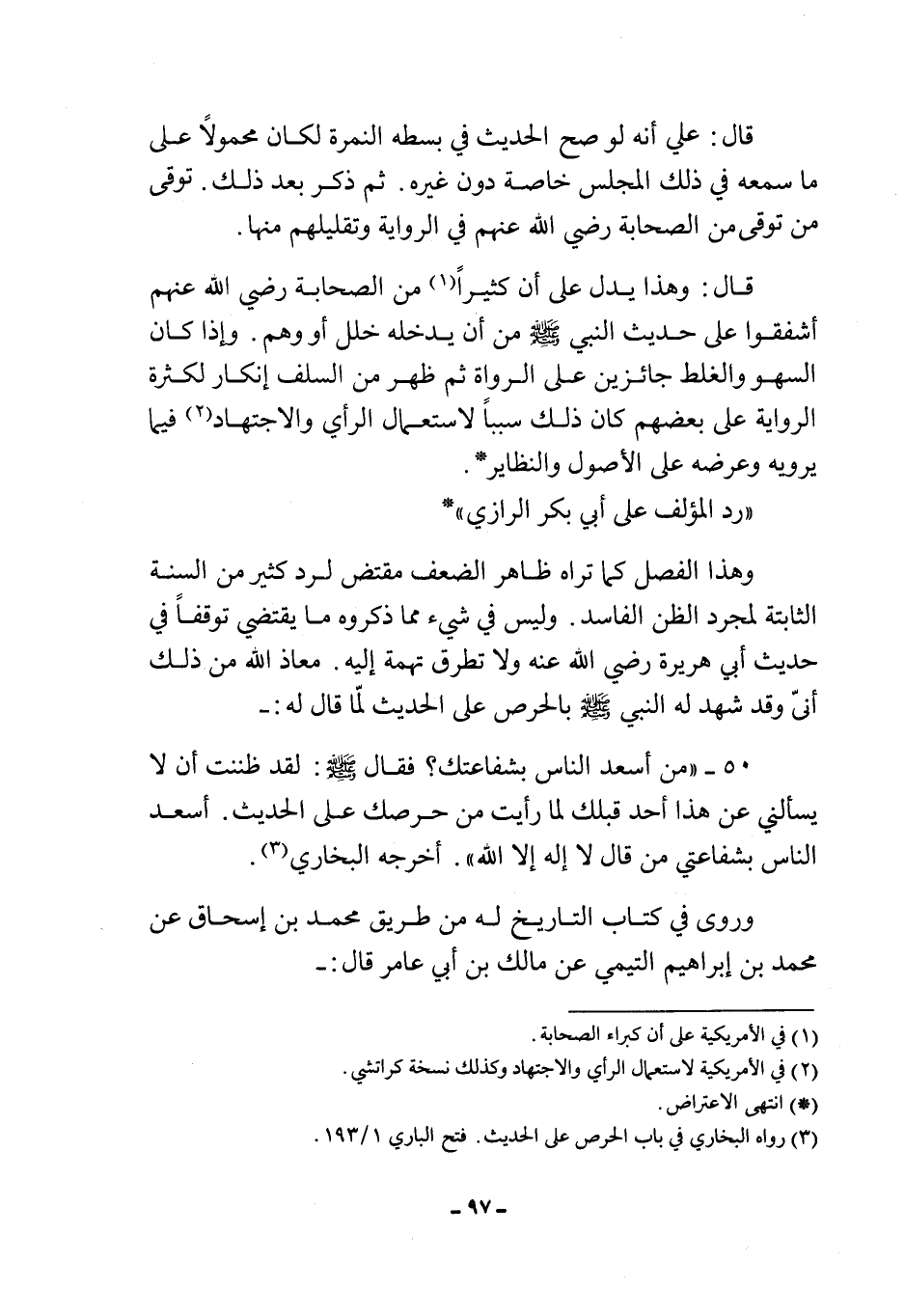 وهذا الفصل كما تراه ظاهر الضعف، مقتض لرد كثير من السنة الثابتة لمجرد الظن الفاسد. وليس في شيء مما ذكروه ما يقتضي توقفاً في حديث أبي هريرة رضي الله عنه ولا تطرق تهمة إليه. معاذ الله من ذلك أنّى وقد شهد له النبي صلى الله عليه وسلم بالحرض على الحديث لمّا قال له: