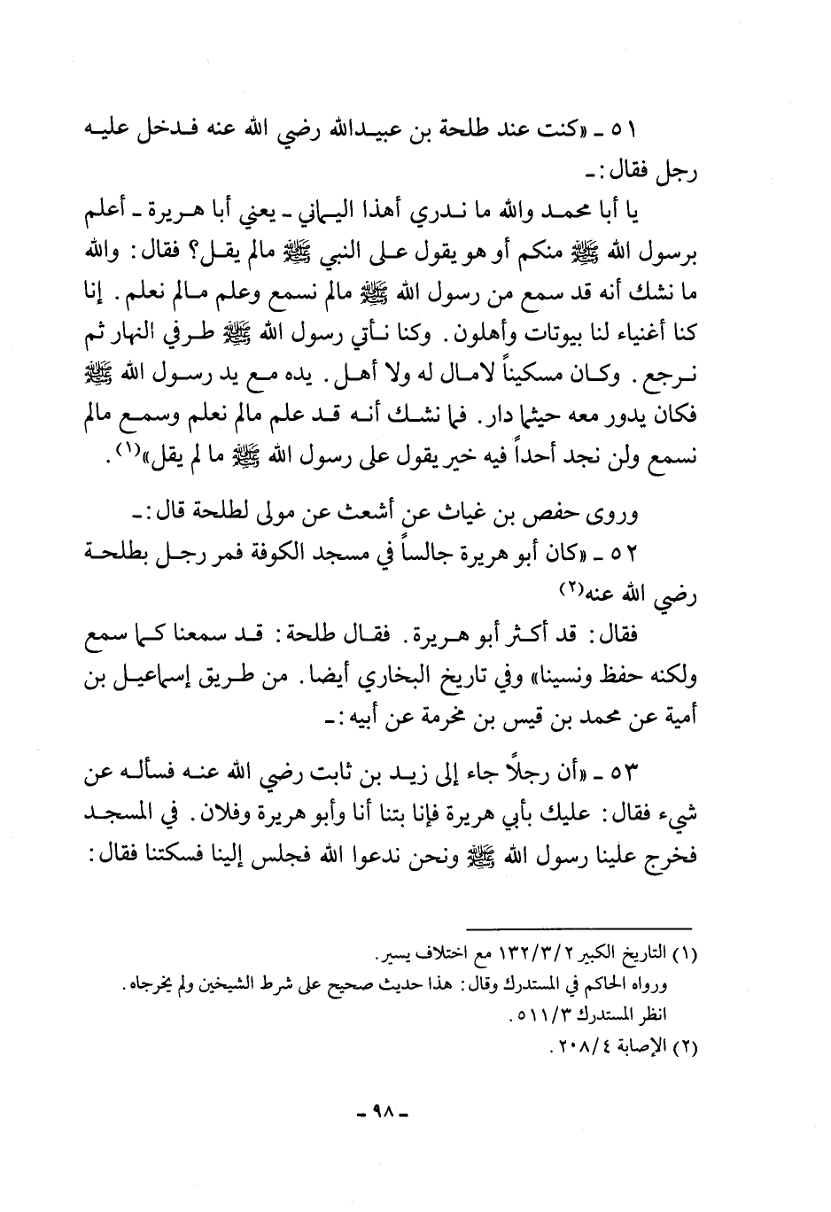 52- "كان أبو هريرة جالساً في مسجد الكوفة، فمر رجل بطلحة رضي الله عنه2.