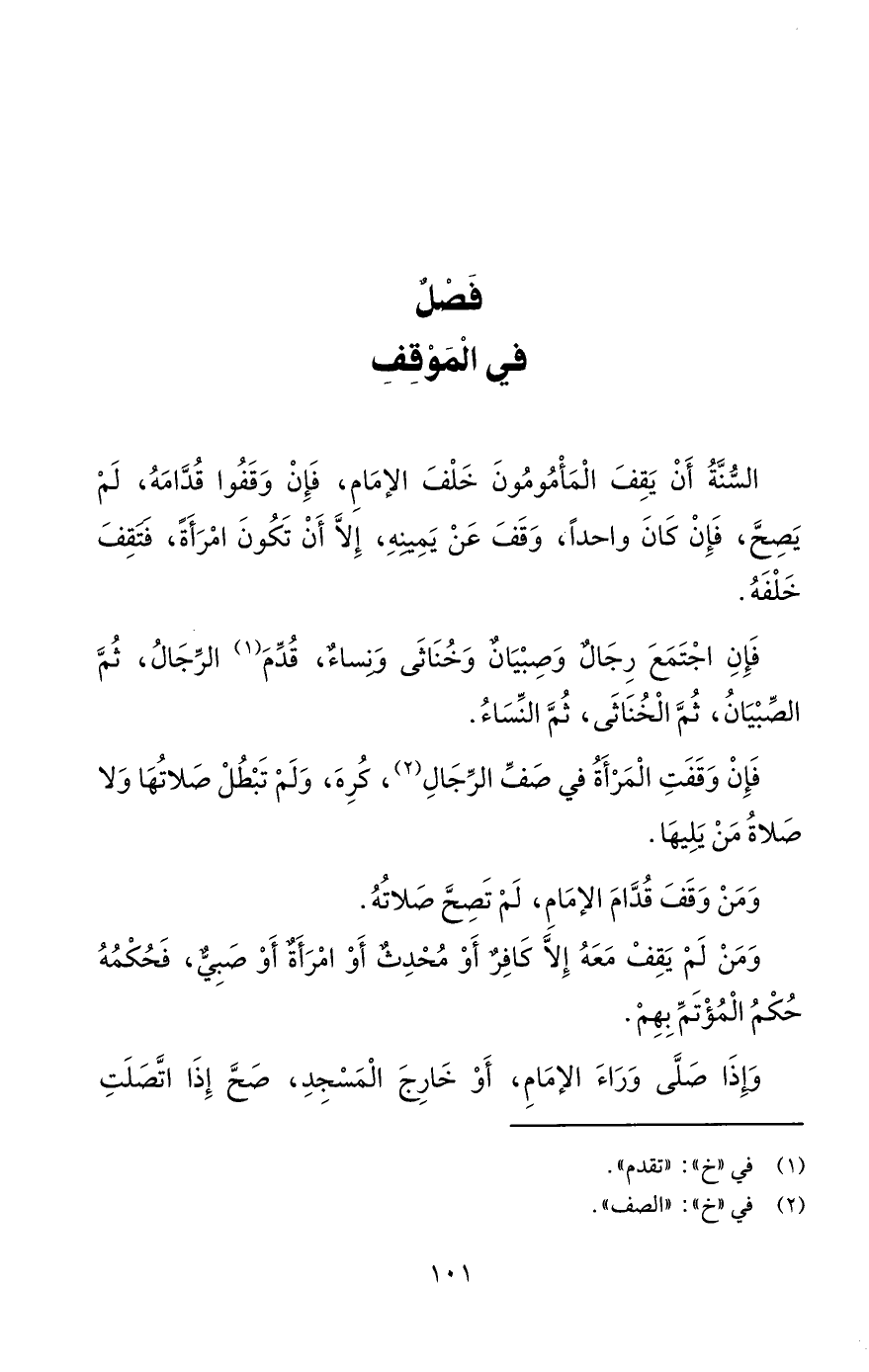 السُّنَّةُ أَنْ يَقِفَ الْمَأْمُومُونَ خَلْفَ الإمَامِ، فَإِنْ وَقَفُوا قُدَّامَهُ، لَمْ يَصِحَّ، فَإِنْ كَانَ واحداً، وَقَفَ عَنْ يَمِينهِ، إِلَّا أَنْ تَكُونَ امْرَأَةً، فتقِفَ خَلْفَهُ.