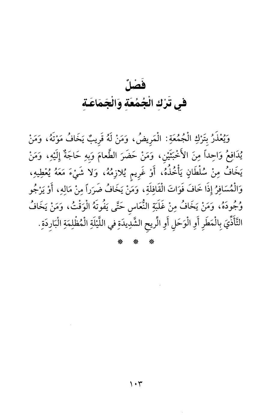 وَيُعْذَرُ بِتَرْكِ الْجُمُعَةِ: الْمَرِيضُ، وَمَنْ لَهُ قَرِيبٌ يَخَافُ مَوْتَهُ، وَمَنْ يُدَافِعُ وَاحِداً مِنَ الأَخْبَثَيْنِ، وَمَنْ حَضَرَ الطَّعامَ وَبِهِ حَاجَةٌ إِلَيْهِ، وَمَنْ يَخَافُ مِنْ سُلْطَانٍ يَأْخُذُهُ، أَوْ غَرِيمٍ يُلازِمُهُ، وَلا شَيْءَ مَعَهُ يُعْطِيهِ، وَالْمُسَافِرُ إِذَا خَافَ فَوَاتَ الْقَافِلَةِ، وَمَنْ يَخَافُ ضَرَراً مِنْ مَالِهِ، أَوْ يَرْجُو وُجُودَهُ، وَمَنْ يَخَافُ مِنْ غَلَبَةِ النُّعَاسِ حَتَّى يَفُوتَهُ الْوَقْتُ، وَمَنْ يَخَافُ التَّاَذِّيَ بِالْمَطَرِ أَوِ الْوَحَلِ أَوِ الِّريحِ الشَّدِيدَةِ فِي اللَّيْلَةِ الْمُظْلِمَةِ الْبَارِدَةِ.