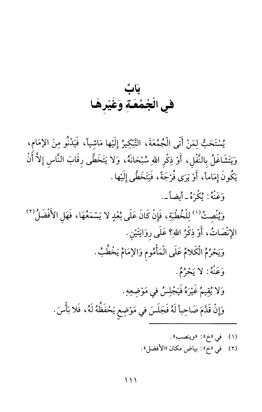 يُسْتَحَبُّ لِمَنْ أَتَى الْجُمُعَةَ، التَّبْكِيرُ إِلَيْها مَاشِياً، فَيَدْنُو مِنَ الإمَامِ، وَيَتَشَاغَلُ بِالنَّفْلِ، أَوْ ذِكْرِ اللهِ سُبْحَانَهُ، وَلا يَتَخَطَّى رِقَابَ النَّاسِ إِلَّا أَنْ يَكُونَ إِمَاماً، أَوْ يَرَى فُرْجَةً، فَيَتَخَطَّى إِلَيْها.