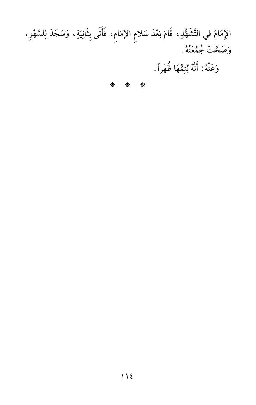 الإِمَامَ فِي التَّشَهُّدِ، قَامَ بَعْدَ سَلامِ الإمَامِ، فَأَتَى بِثَانِيَةٍ، وَسَجَدَ لِلسَّهْوِ، وَصَحَّتْ جُمُعَتُهُ.
