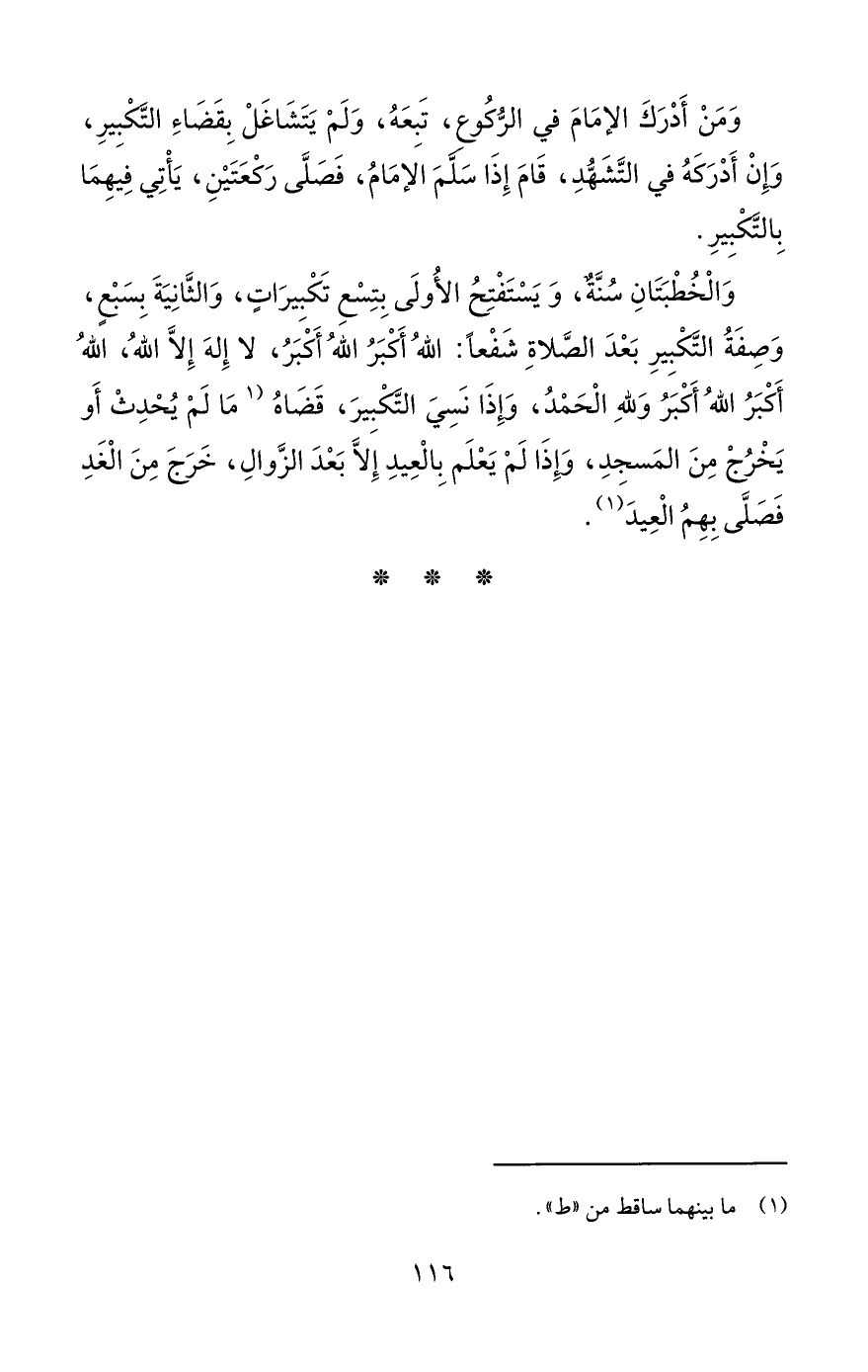 وَالْخُطْبَتَانِ سُنَّةٌ، وَيَسْتَفْتِحُ الأُولَى بِتِسْعِ تَكْبِيرَاتٍ، وَالثَّانِيَةَ بِسَبعٍ، وَصِفَةُ التَّكْبِيرِ بَعْدَ الصَّلاةِ شَفْعاً: اللهُ أَكْبَرُ اللهُ أَكْبَرُ، لا إِلهَ إِلَّا اللهُ، اللهُ أَكْبَرُ اللهُ أَكْبَرُ وَللهِ الْحَمْدُ، وَإِذَا نَسِيَ التَّكْبِيرَ، قَضَاهُ (1 مَا لَمْ يُحْدِثْ أَو يَخْرُجْ مِنَ المَسجدِ، وَإِذَا لَمْ يَعْلَم بِالْعِيدِ إِلَّا بَعْدَ الزَّوالِ، خَرَجَ مِنَ الْغَدِ فَصَلَّى بِهِمُ الْعِيدَ (¬1).