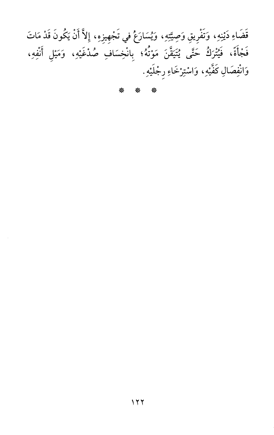قَضَاءِ دَيْنهِ، وَتَفْرِيقِ وَصيَّتِهِ، وَيُسَارَعُ فِي تَجْهِيزهِ، إِلَّا أَنْ يَكُونَ قَدْ مَاتَ فَجْأَةً، فَيُتْرَكُ حَتَّى يُتَيَقَّنَ مَوْتُهُ؛ بِانْخِسَافِ صُدْغَيْهِ، وَمَيْلِ أَنْفِهِ، وَانْفِصَالِ كَفَّيْهِ، وَاسْتِرْخَاءِ رِجْلَيْهِ.